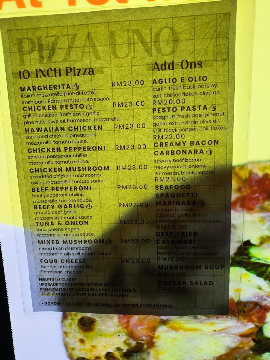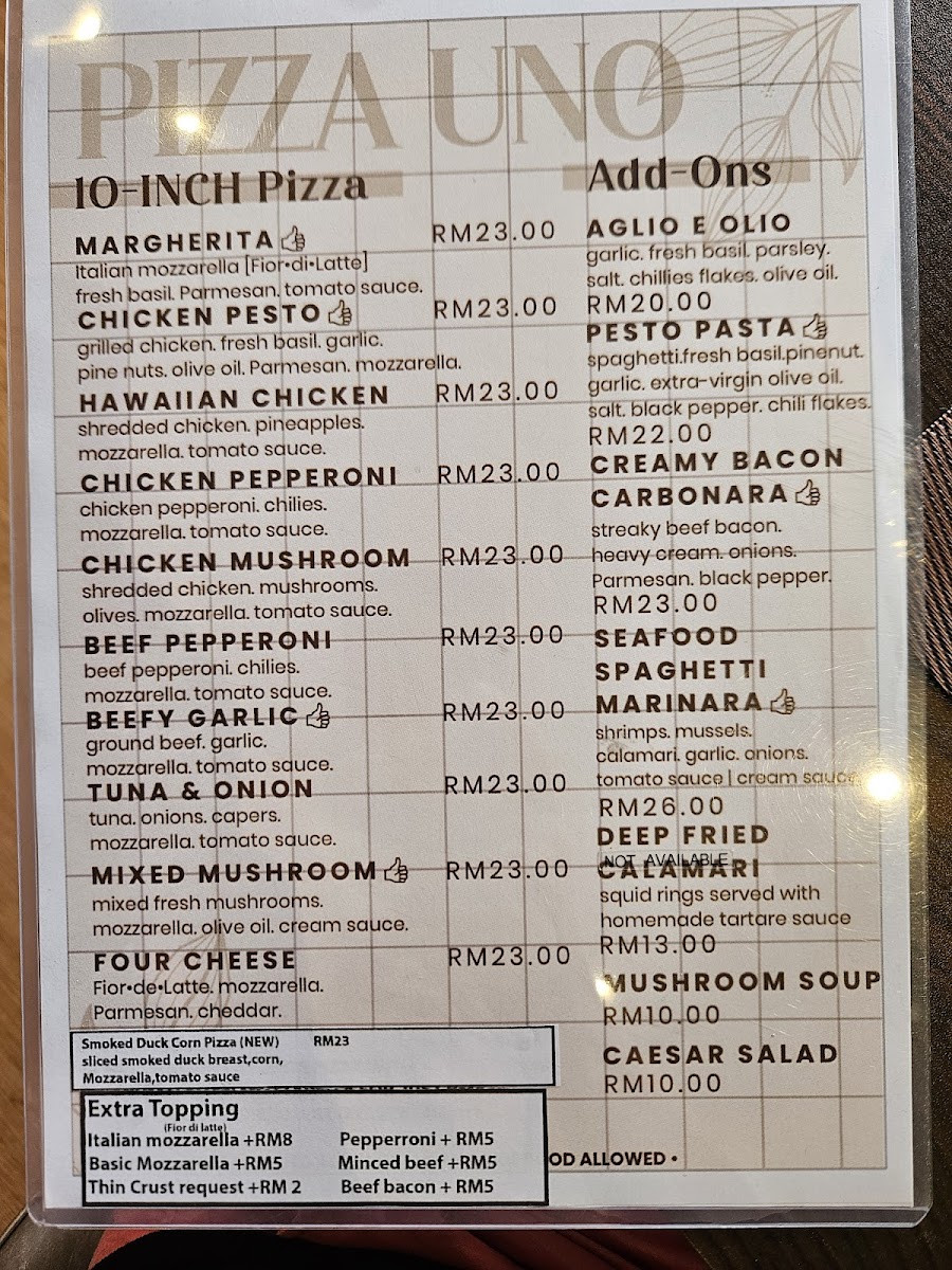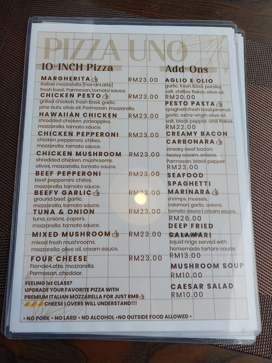 Pizza Uno’s menu offers a delightful variety of dishes, each crafted with fresh ingredients that cater to diverse tastes. Starting with the Mushroom Soup, it’s a creamy, rich appetizer that sets the tone for a hearty meal. For pizza lovers, the Chicken Pesto Pizza delivers a flavorful, aromatic experience, while the Margherita Pizza offers a classic, simple delight with its fresh tomatoes and mozzarella. The Caesar Salad is a crisp, refreshing choice, perfectly complementing the heavier dishes. Pasta enthusiasts will enjoy the Pesto Pasta, which bursts with vibrant flavors, and the indulgent Carbonara Pasta, creamy and comforting. If you prefer something savory, the Beef Pepperoni is a must-try, offering a zesty, spicy punch. To complete the meal, a cup of Lavazza Coffee offers a satisfying, robust finish to the dining experience. With dishes like these, Pizza Uno provides a satisfying and varied menu that makes it a great choice for any occasion.