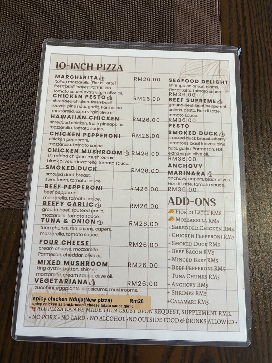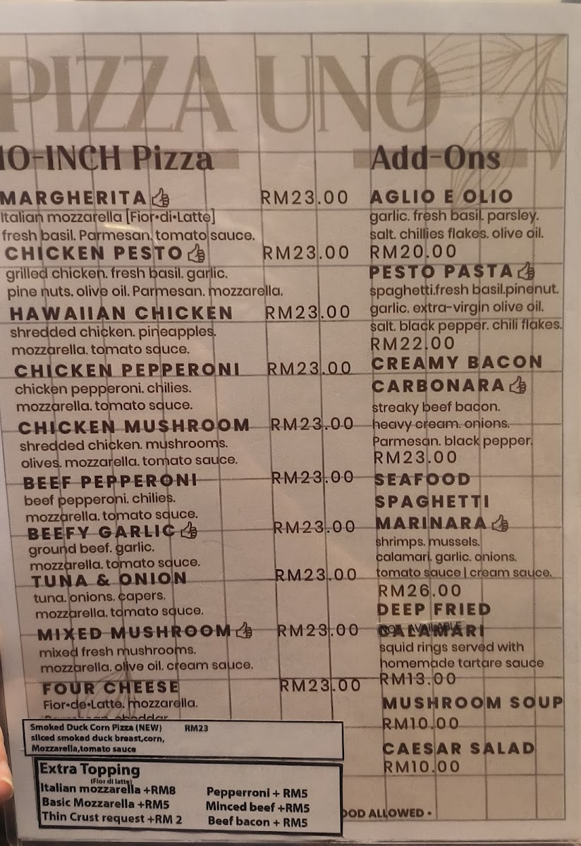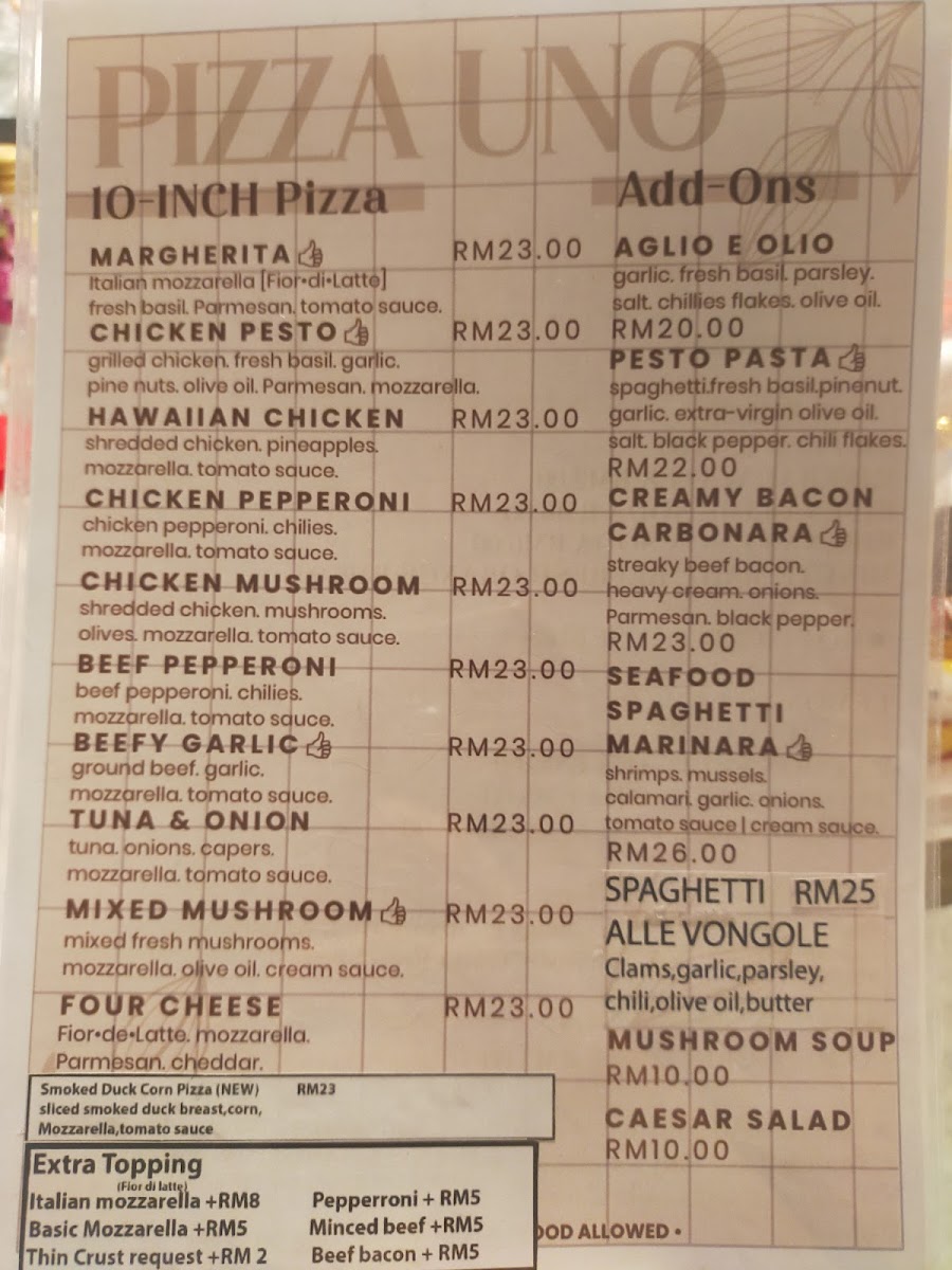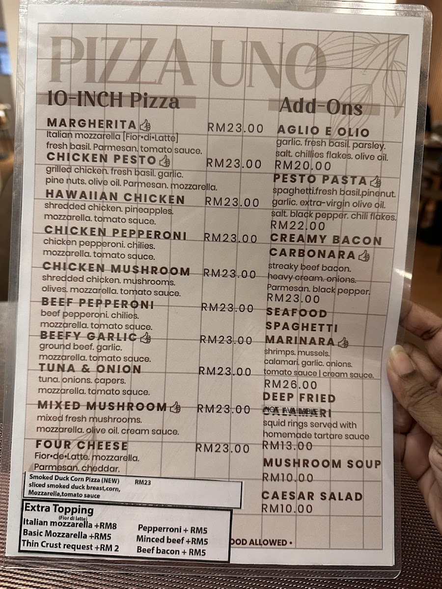 Pizza Uno’s menu offers a delightful variety of dishes, each crafted with fresh ingredients that cater to diverse tastes. Starting with the Mushroom Soup, it’s a creamy, rich appetizer that sets the tone for a hearty meal. For pizza lovers, the Chicken Pesto Pizza delivers a flavorful, aromatic experience, while the Margherita Pizza offers a classic, simple delight with its fresh tomatoes and mozzarella. The Caesar Salad is a crisp, refreshing choice, perfectly complementing the heavier dishes. Pasta enthusiasts will enjoy the Pesto Pasta, which bursts with vibrant flavors, and the indulgent Carbonara Pasta, creamy and comforting. If you prefer something savory, the Beef Pepperoni is a must-try, offering a zesty, spicy punch. To complete the meal, a cup of Lavazza Coffee offers a satisfying, robust finish to the dining experience. With dishes like these, Pizza Uno provides a satisfying and varied menu that makes it a great choice for any occasion.